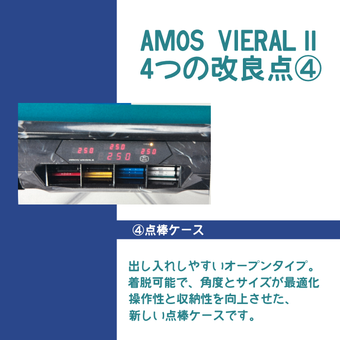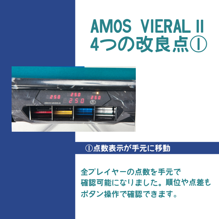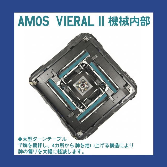 点数表示機能と音声にて案内するV.I.S(Voice Inform System)も搭載!28mm麻雀牌を使用し4ヶ所同時吸込みと独自のセット方式により更に麻雀牌の偏りを極限まで改善した「アモス ヴィエラ2」が、お求めやすい価格で登場です。